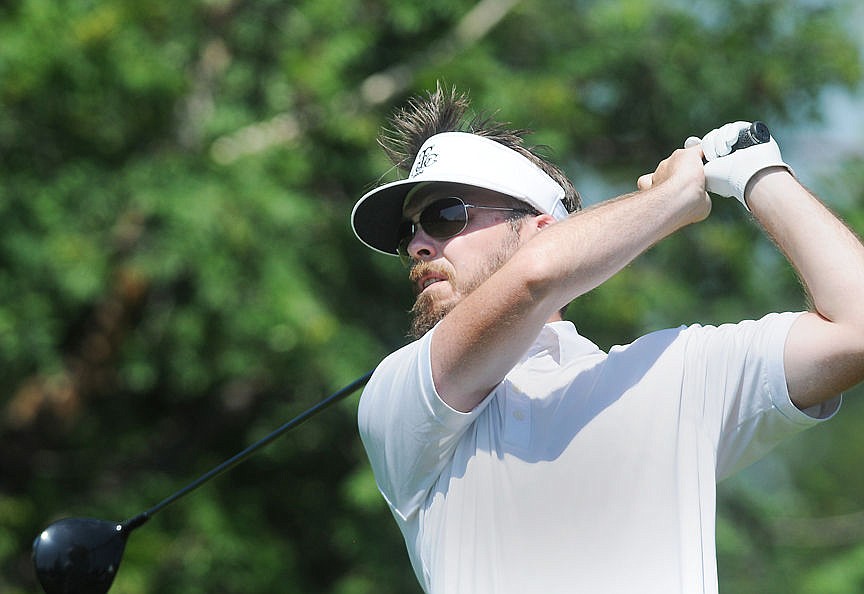 Jesse Rodman watches his drive from the first tee during the Whitefish Lake Golf Club's 79th annual Earl Hunt Fourth of July Tournament. (Aaric Bryan/Daily Inter Lake)