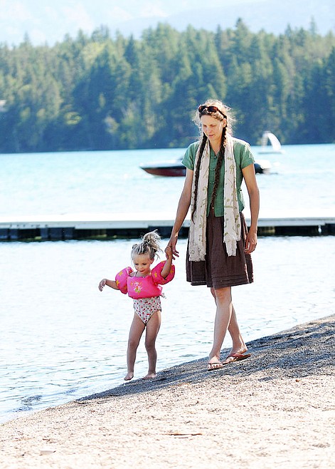 Lindsey Bennett walks with her daughter Aenea on the beach of Lake Five. (Aaric Bryan/Daily Inter Lake)