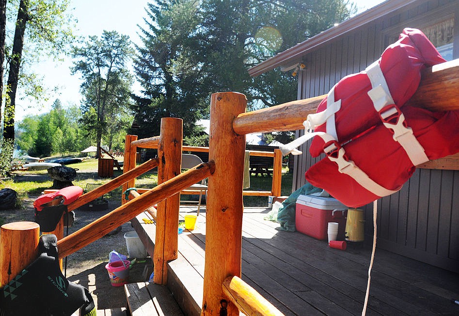 Life jackets and beach toys line the patio of one of the cabins at Lake 5 Resort. (Aaric Bryan/Daily Inter Lake)