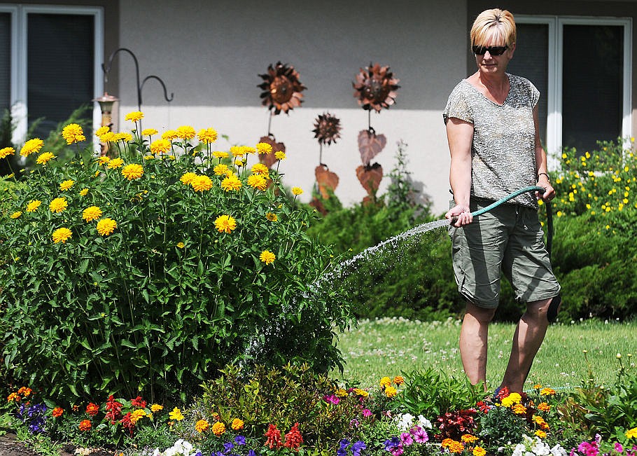 Kathy Meyer waters her flowers in Kalispell on Friday. (Aaric Bryan/Daily Inter Lake)
