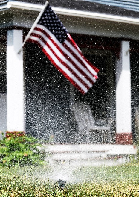 A sprinkler waters a lawn on Fourth Avenue East in Kalispell Friday. (Aaric Bryan/Daily Inter Lake)