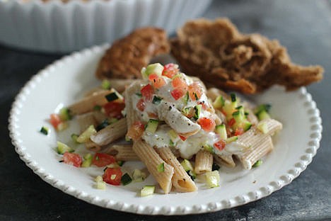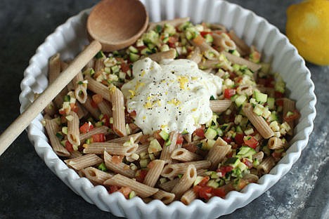 To make the point, I created this fast and flavorful pasta dinner that tosses whole-wheat penne with cooling diced tomatoes and zucchini, a mess of fresh basil and a dollop of creme fraiche to tie it all together. Of course, feel free to substitute whatever fresh veggies inspire you. But since you're serving them raw, be sure to finely chop them.