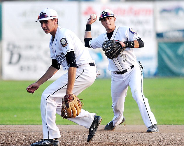 Twins shortstop Jayce Fagerland throws to first as second baseman Vinny Smith looks on during the Sapa-Johnsrud Memorial Tournament. (Aaric Bryan/Daily Inter Lake)