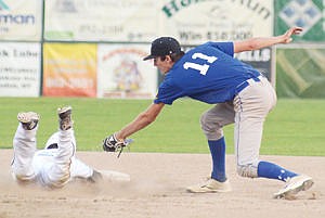 Libby's Erik Lauer reaches for a tag at second base in a game against the Glacier Twins A on Wednesday, July 8 in Whitefish.