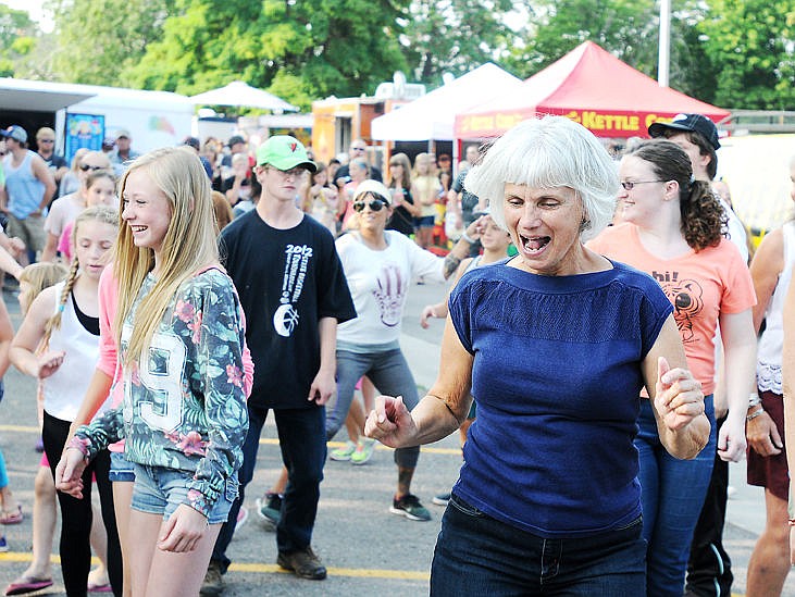 Kathy Gerdl laughs as she dances during the flash mob. (Aaric Bryan/Daily Inter Lake)