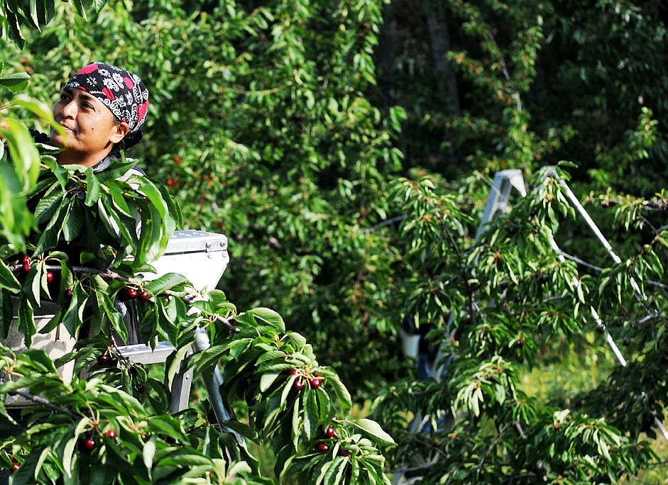 Rosa Martinez picks cherries at Bowman Orchards on Friday. (Aaric Bryan/Daily Inter Lake)