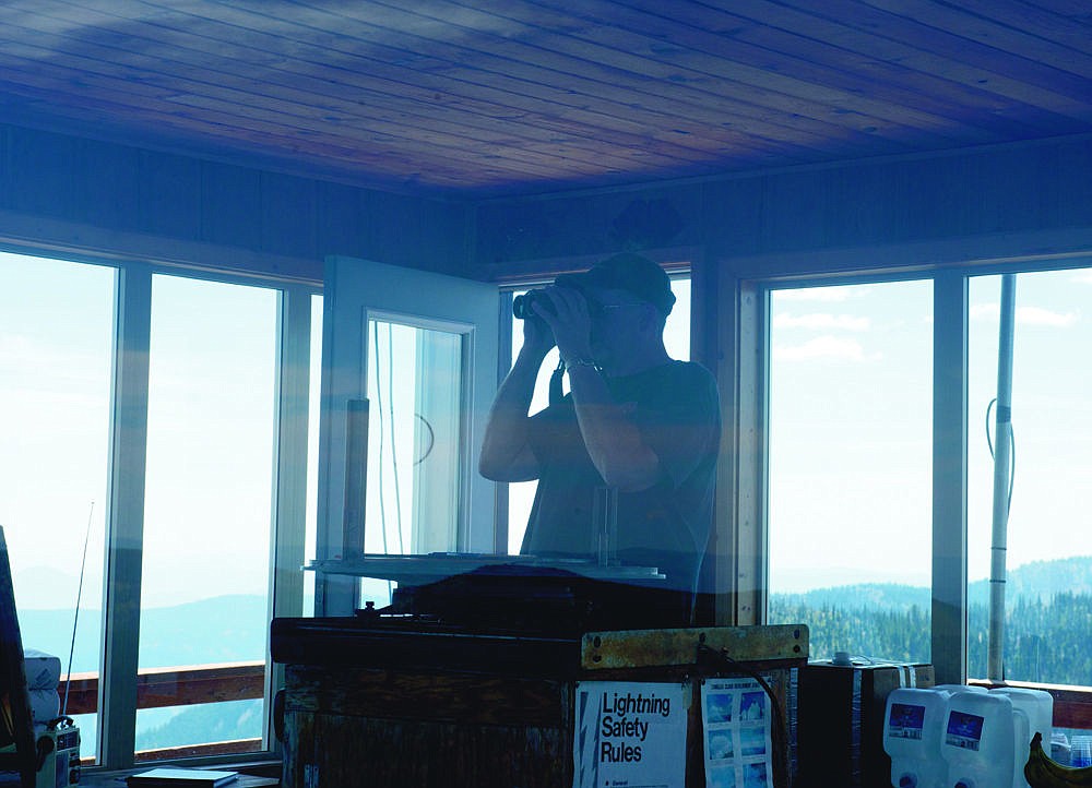 Craig Phillips watches out of the Eddy Mountain lookout tower for possible wild land fires last week.