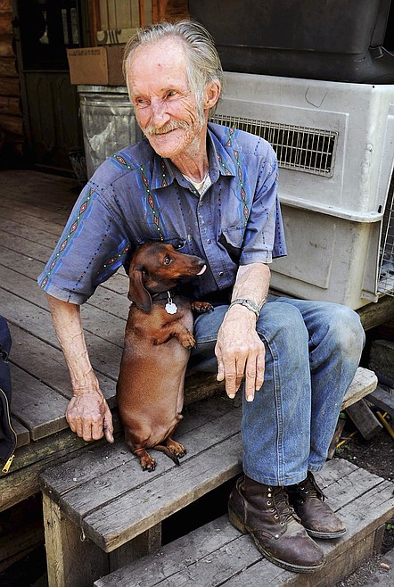 Stuart Voigt sits outside his home with his dog Bud near Bearmouth , Mont. on Wednesday, July 8, 2015. The Missoula County sheriff's department is seeking donations on behalf of Voigt, a 74-year-old man who lost his life savings on the false promise of receiving millions of dollars and a Mercedes Benz in a sweepstakes scam. (Michael Gallacher/The Missoulian via AP) MANDATORY CREDIT