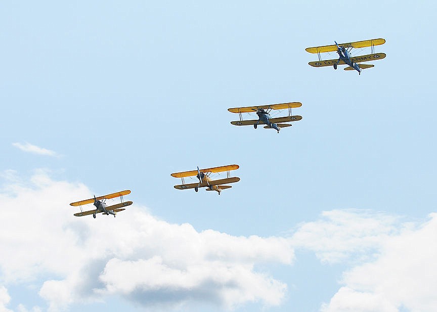 Four Boeing Stearman fly over the Stonehenge Air Museum near Eureka on Tuesday. The planes are with the Puget Sount Antique Aircraft tour and will be at the Kalispell City Airport from 8 a.m. to 3 p.m. on Wednesday. (Aaric Bryan/Daily Inter Lake)