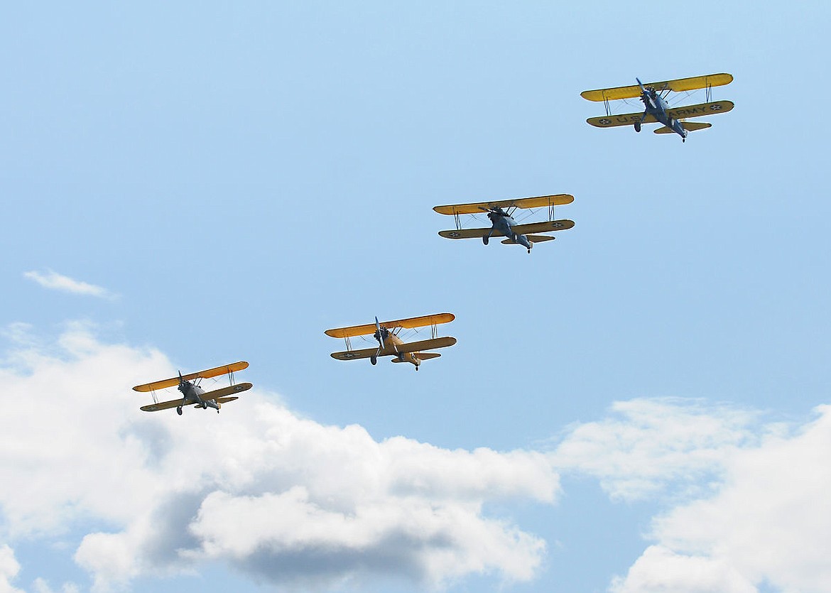 Four Boeing Stearman biplanes fly over the Stonehenge Air Museum near Fortine on Tuesday. The planes are with the Puget Sound Antique Aircraft Tour and will be at Kalispell City Airport from 8 a.m. to 3 p.m. today. The public is invited to come see the vintage planes. (Aaric Bryan photos/Daily Inter Lake)
