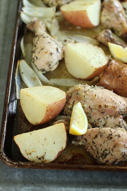 When ready to cook, heat the oven to 375 F. Coat a rimmed baking sheet with cooking spray. Dump the contents of the bag onto the pan, spread into an even layer, then bake uncovered until the chicken registers 175 degrees at the thickest parts, about 40 minutes. If the potatoes and onions brown too quickly on one side, turn them for more even cooking.