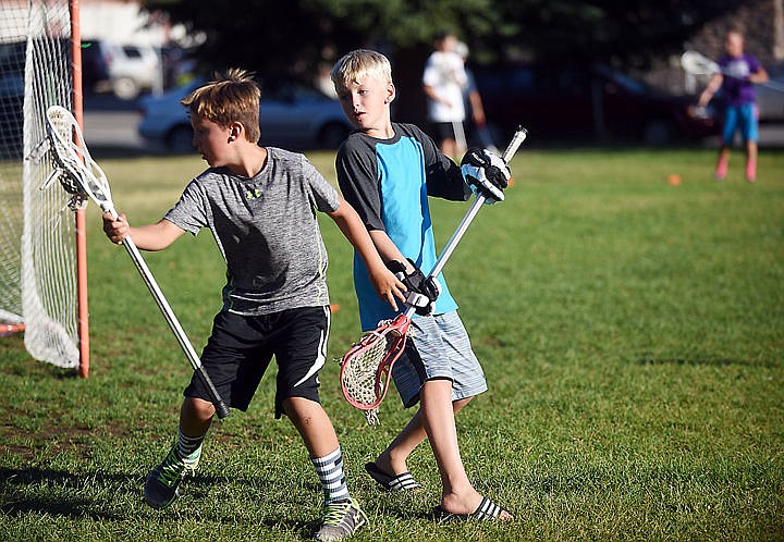 Graham Fellows, 8, left and and his brother Griffin, 10, of Lemoore, California play lacrosse in the evening light on Tuesday, July 14, at the Whitefish Farmer's Market. The night got off to a wet start with rain rolling in around 5 p.m. but the storm passed and the market went on into the evening. (Brenda Ahearn/Daily Inter Lake)