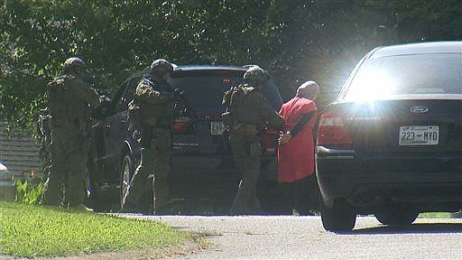 In this frame from video, law enforcement officers detain a woman as they surround a house in Hixson, Tenn., Thursday, July 16, 2015. A gunman unleashed a barrage of fire at two sites a few miles apart in Chattanooga, killing several, officials said. The attacker was also killed. (AP Photo/Alex Sanz)