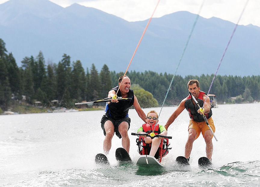 Tristan Dishon, 11, laughs as he is helped by Mark Drew, left, and Jeff Carlson on a sit ski during the Dream Adaptive Water Sports Camp on Echo Lake Thursday. (Aaric Bryan/Daily Inter Lake)