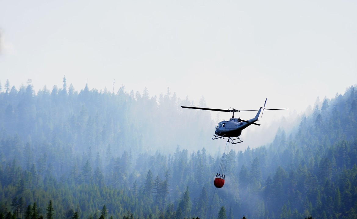 A helicopter brings a bucket of water to a fire near Little Bitterroot Lake. The fire was estimated at 2.5 acres. (Aaric Bryan/Daily Inter Lake)