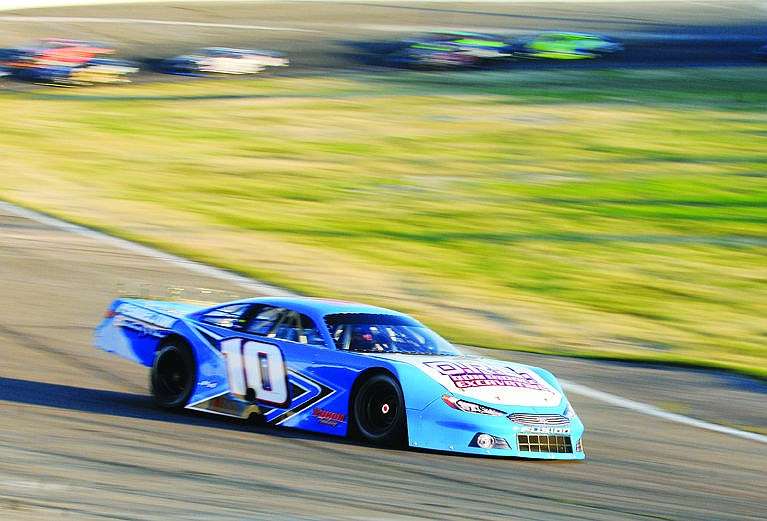 Owen Riddle speeds into the third turn early in the Montana 200 on Saturday. Riddle started on the pole and led the first 100 laps of the race. (Aaric Bryan/Daily Inter Lake)