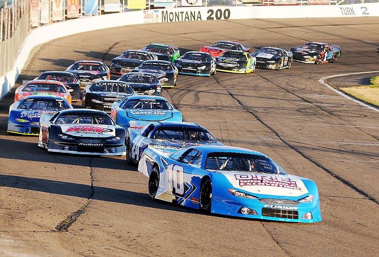 Owen Riddle leads the field down the backstretch early in the Montana 200 on Saturday. Riddle started on the pole and led the first 100 laps of the race. (Aaric Bryan/Daily Inter Lake)
