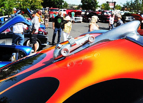 The hood of Mark and Pam Cyr's 1954 Hudson Hornet shines under the sund during the show and shine of the Glacier Rally in the Rockies on Saturday. (Aaric Bryan/Daily Inter Lake)