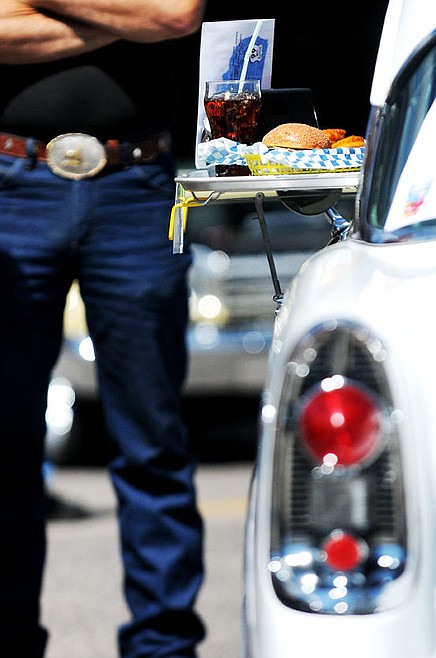 A food tray hangs from the window of Tom and Noes Watkins 1956 Chevy Bel Air. (Aaric Bryan/Daily Inter Lake)