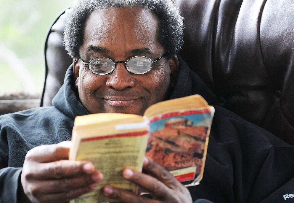 Dr. Walter Roberts smiles as he reads Plato during a lesson at the Square Peg Ranch in Polebridge on Friday. (Aaric Bryan/Daily Inter Lake)