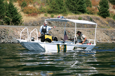 On Sunday, handlers from Spokane and Priest Lake search-and-rescue teams searched the shoreline while another dog aboard a johnboat searched the surface of the lake for the scent of a cadaver.