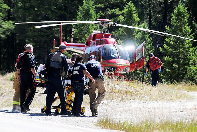 First responders transport the driver of semi involved in a one-vehicle rollover to the ALERT helicopter on Tuesday. (Aaric Bryan/Daily Inter Lake)