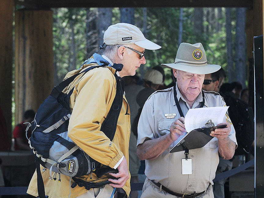 John Schwabe, left, checks with volunteer Bob Guon to see if his name is on the list of people with cars stuck on Going-to-the-Sun-Road. On Wednesday, Schwabe was able to get a ride to his car parked at Siyeh Bend. (Aaric Bryan/Daily Inter Lake)