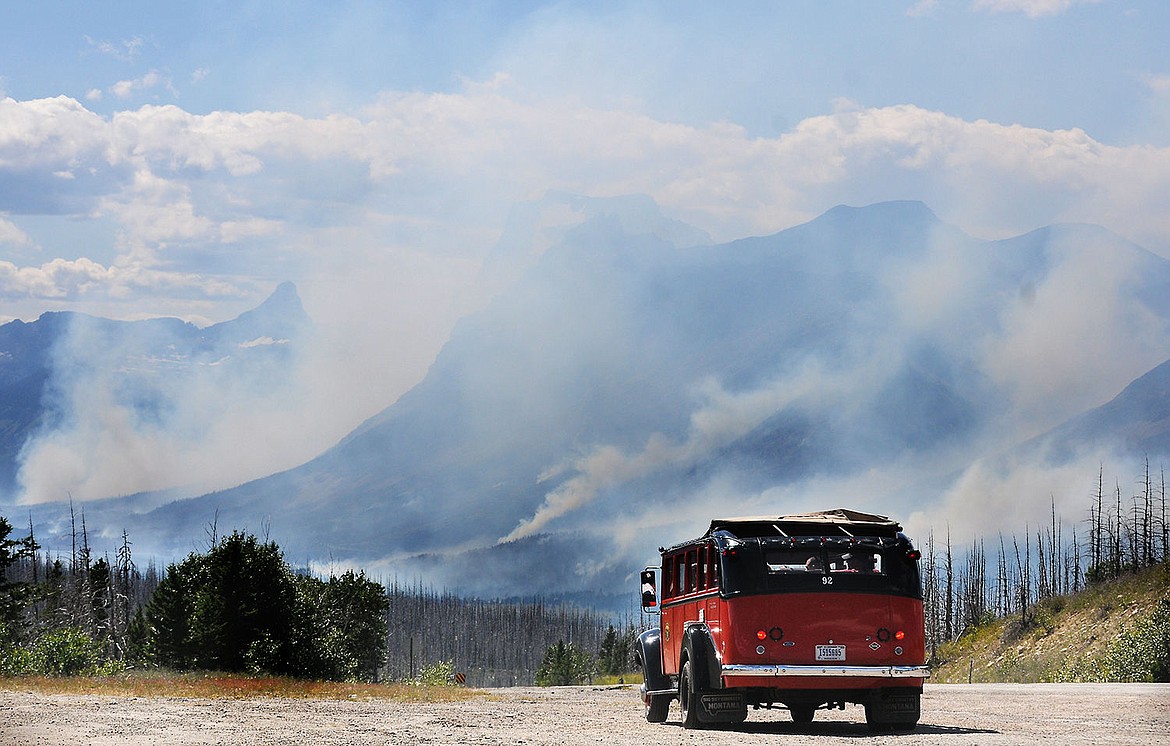 A Glacier National Park Red Bus is pulled off the side of U.S. 89 near St. Mary to give the sightseers a view of the Reynolds Creek Fire on Friday, July 24, 2015. (Aaric Bryan/Daily Inter Lake)