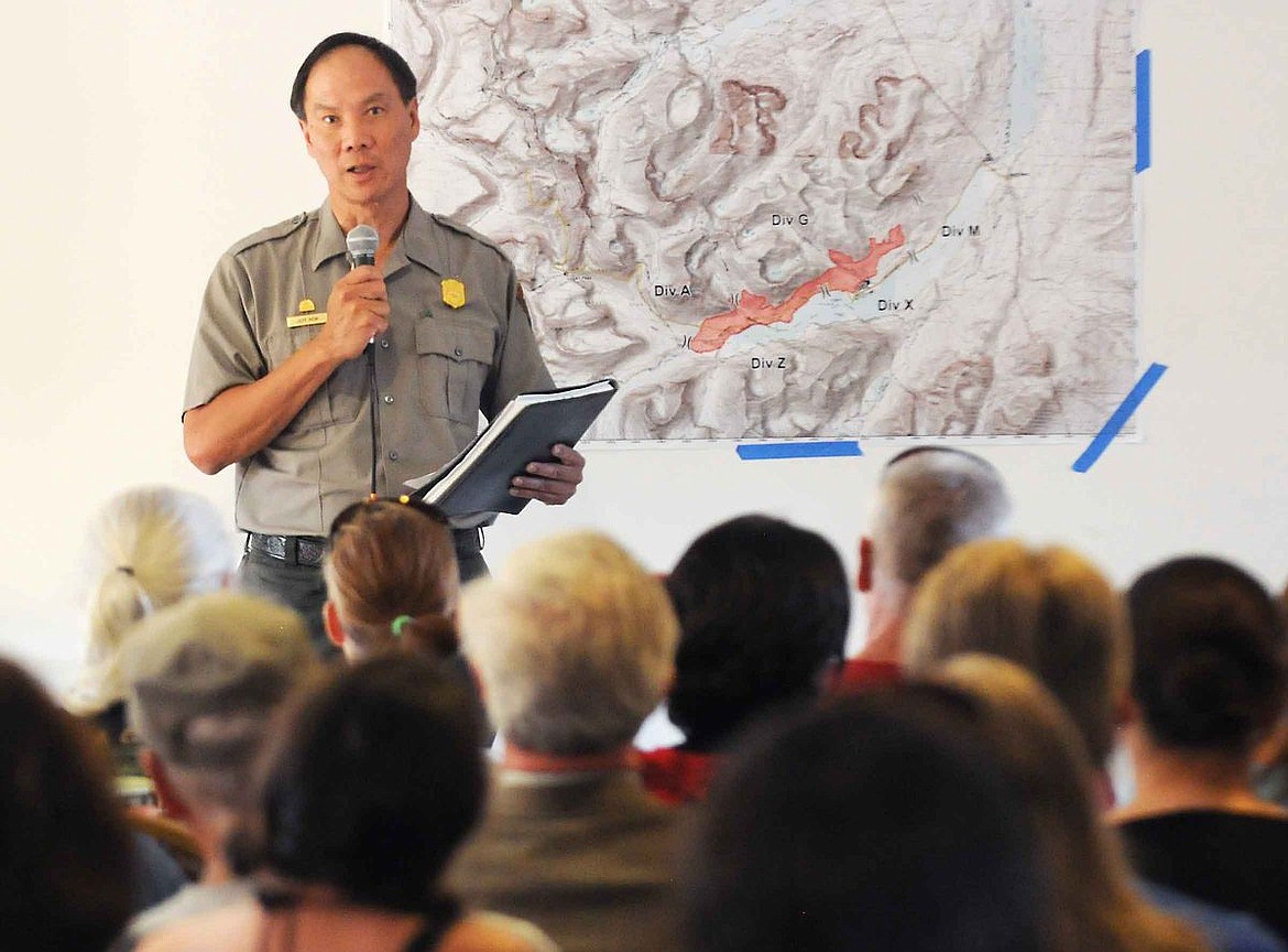 Glacier National Park Superintendent Jeff Mow speaks to the crowd during a public information meeting in St. Mary on Friday. (Aaric Bryan/Daily Inter Lake)