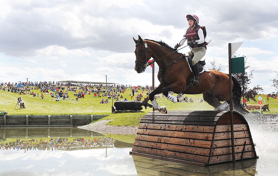 Alexandra Tett clears an obstacle in the water as a large crowd watches from Spectator Hill during The Event at Rebecca Farm on Saturday. (Aaric Bryan/Daily Inter Lake)