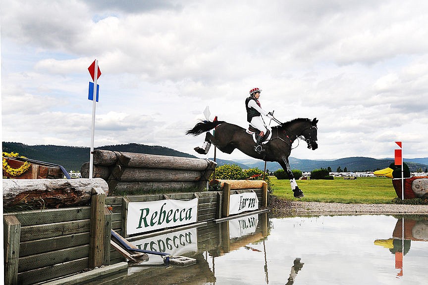 Jennifer McFall on her horse High Times sails over a jump and into the water during the CIC3 cross county at The Event at Rebecca Farm on Saturday. (Aaric Bryan/Daily Inter Lake)