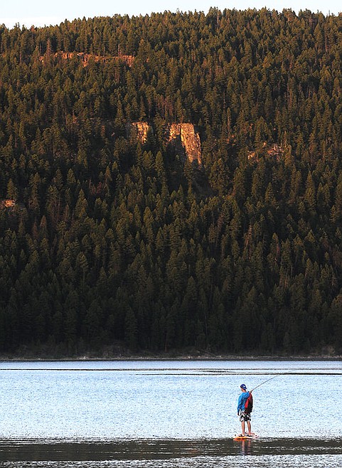 A fisherman casts while on a paddleboard near the Tally Lake Campground. The campground is on the northern shores of the lake an offers dozens of campsites for RVs and tents. (Aaric Bryan/Daily Inter Lake)