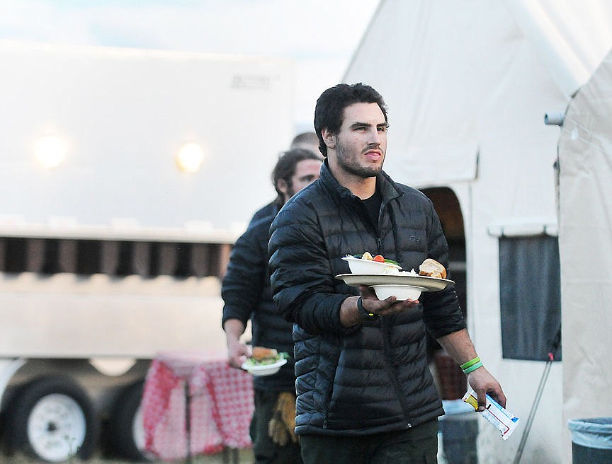 Gus Conrad of Grayback Forestry of Missoula grabs dinner after fighting the Reynolds Creek Fire on Friday. Firefighters are fed 6,000 calories of food each day at the camp. (Aaric Bryan/Daily Inter Lake)
