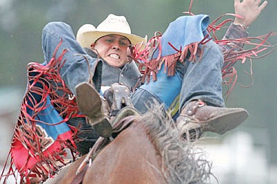 Bareback riding with Dantan Bertsch of Eastend, Saskatchewan aboard "Chute Boss" for 71 points Saturday during Kootenai River Rodeo 2015.
