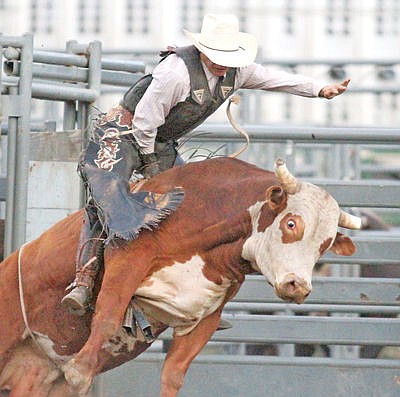 Alex Guzman of Manteca, Calif., aboard "Cowboy Town" Friday at the Kootenai River Rodeo.