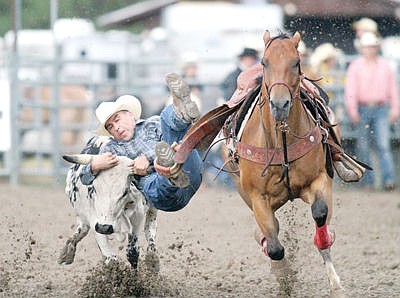 Saturday night steer wrestling with Riley Jones from Walla Walla, Wash. 11.6 seconds.
