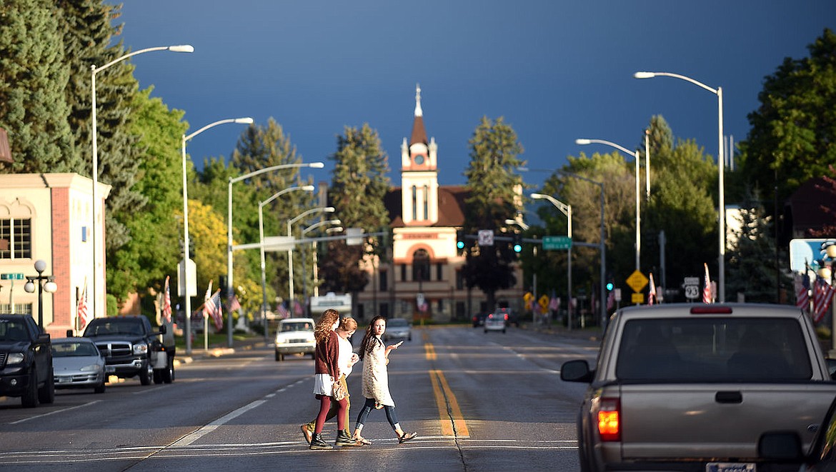Pedestrians are caught in the rays of sunset as they walk across downtown Kalispell on Monday, July 27. (Brenda Ahearn/Daily Inter Lake)