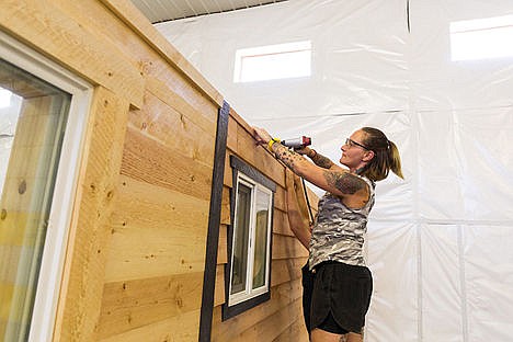 POST FALLS - Wearing safety glasses and toting construction tools, Melissa Pierce focuses, measures and begins to drill into wood that will become part of the exterior of a tiny house.
