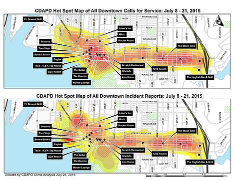 This week, the Coeur d'Alene Police Department's Crime Analysis Department generated two "hot spot" maps - one for incidents that generated official reports and another for responses that did not - of the downtown area. According to Sgt. Christie Wood, the maps are particularly beneficial to the Community Action Team - a group created by Chief Lee White to focus on going where they're needed most, while interacting as much as possible with business owners and residents.
