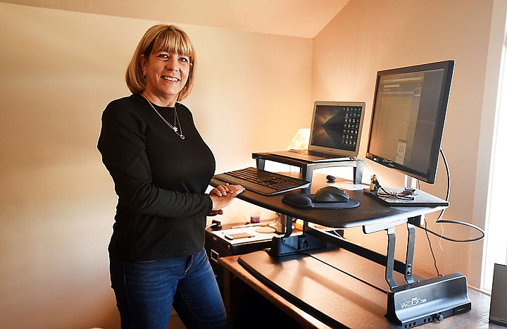 Tracy Freeman is pictured at her home office north of Kalispell. One of the features Freeman wanted for her personal office was a desk that could be used standing or seated because she did not want to be sitting in front of the computer screen all day. Freeman is program technology director for Pearson Assessments, based in Iowa City, Iowa, but does her job from her Kalispell home. (Brenda Ahearn/Daily Inter Lake)