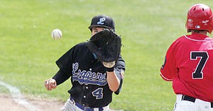 Second baseman Collin Johnson covering first, first out top of third on a throw from pitcher Oliver Grupenhoff second of a doubleheader vs. Cranbrook Bandits.
