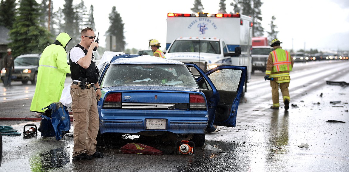 Travis Bruyer of the Flathead County Sheriff's Office calls in more responders to the scene of a fatal car wreck on U.S. Highway 2 on Tuesday, June 2, just north of Birch Grove. (Brenda Ahearn/Daily Inter Lake)