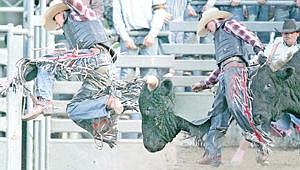 Brandon Wallentine of Paris, Idaho gets an unexpected "bonus ride" aboard Blackfoot to score 81 points Saturday night at the Incredi-Bull Bull Riding event. Brandon's paycheck for the evening - $980 June 11, 2011