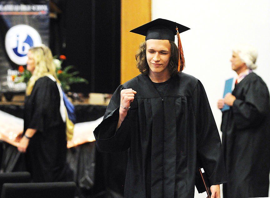 Dylan Salisbury celebrates after receiving his diploma at the 2015 Flathead High School Commencement. (Aaric Bryan/Daily Inter Lake)