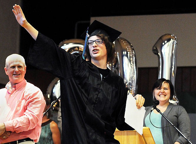 Jeramey McGinnis waves to the crowd after receiving his diploma during the Linderman Education Center Commencement on Thursday. (Aaric Bryan/Daily Inter Lake)