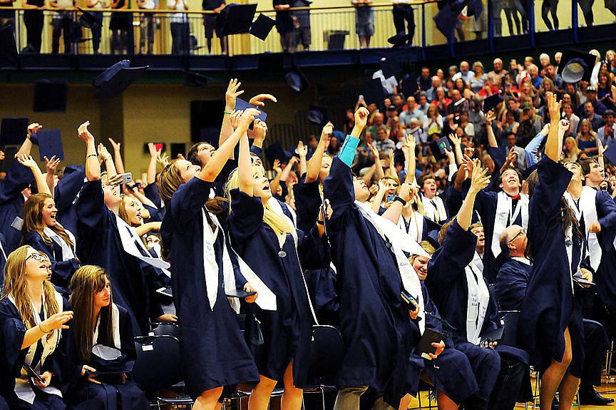 Glacier graduates throw their caps in the air at the end of the commencement ceremony on Saturday. (Aaric Bryan/Daily Inter Lake)