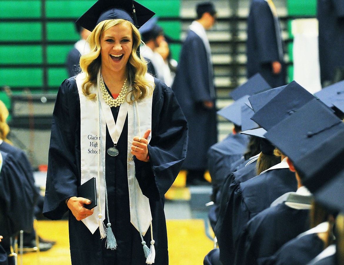 Jessica Chery gives a thumbs-up after receiving her diploma Saturday during the 2015 Glacier High School Commencement in the school gym. There were 270 Glacier graduates. (Aaric Bryan/Daily Inter Lake)