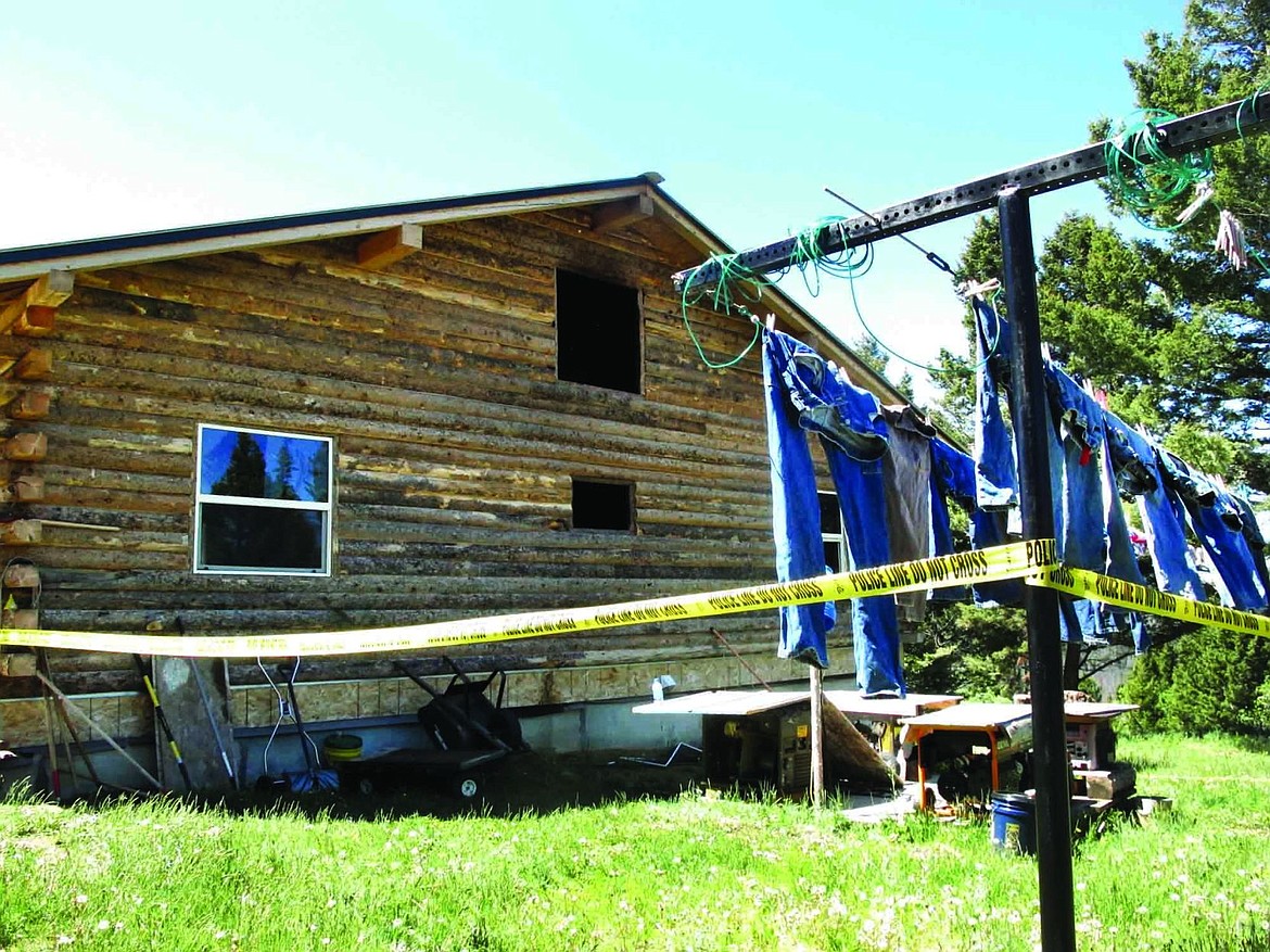 Police tape rings a fire-damaged cabin in the Beaverhead-Deer Lodge Forest outside Deer Lodge on Monday, where a Montana man shot and killed his wife and three children, set a fire in the family's remote cabin and then killed himself, (AP Photo/Matt Volz)