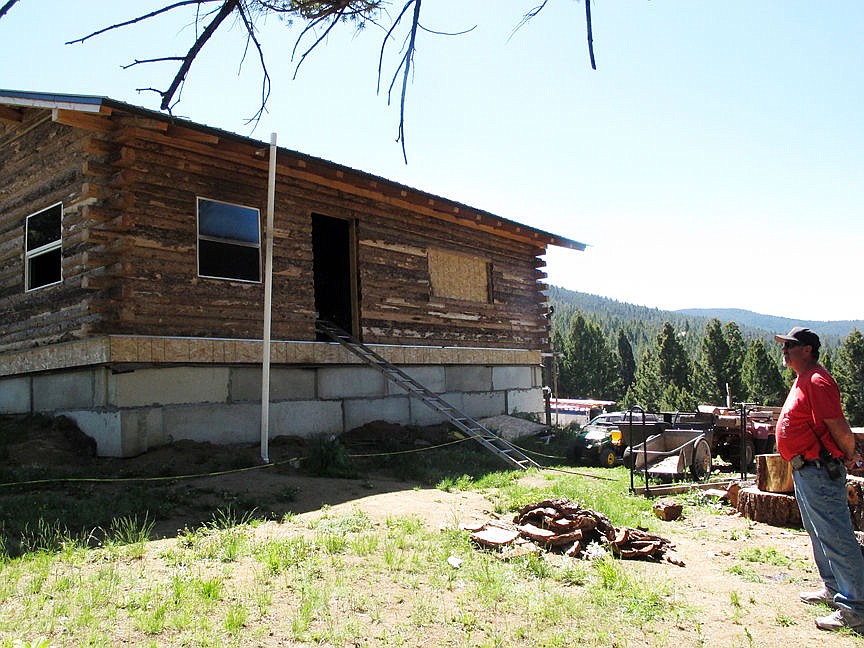 Detective Steve Barclay stands in front of the fire-damaged cabin near Deer Lodge where a man shot and killed his wife and three children Sunday morning. (AP photo) set a fire in the family's remote cabin and then killed himself, officials in Anaconda-Deer Lodge County said. Detective Steve Barclay said an investigation determined the man shot his wife and 1-year-old child inside, then went outside and shot two other children — ages 4 and 6. He carried the bodies of the children inside and laid them down on a bed in the cabin, Barclay said. (AP Photo/Matt Volz)