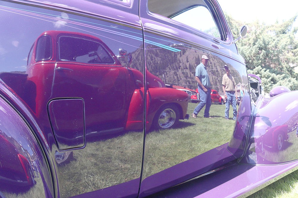 An entry and car show attendees are reflected in the door of another entry during the annual car show in Superior last week.